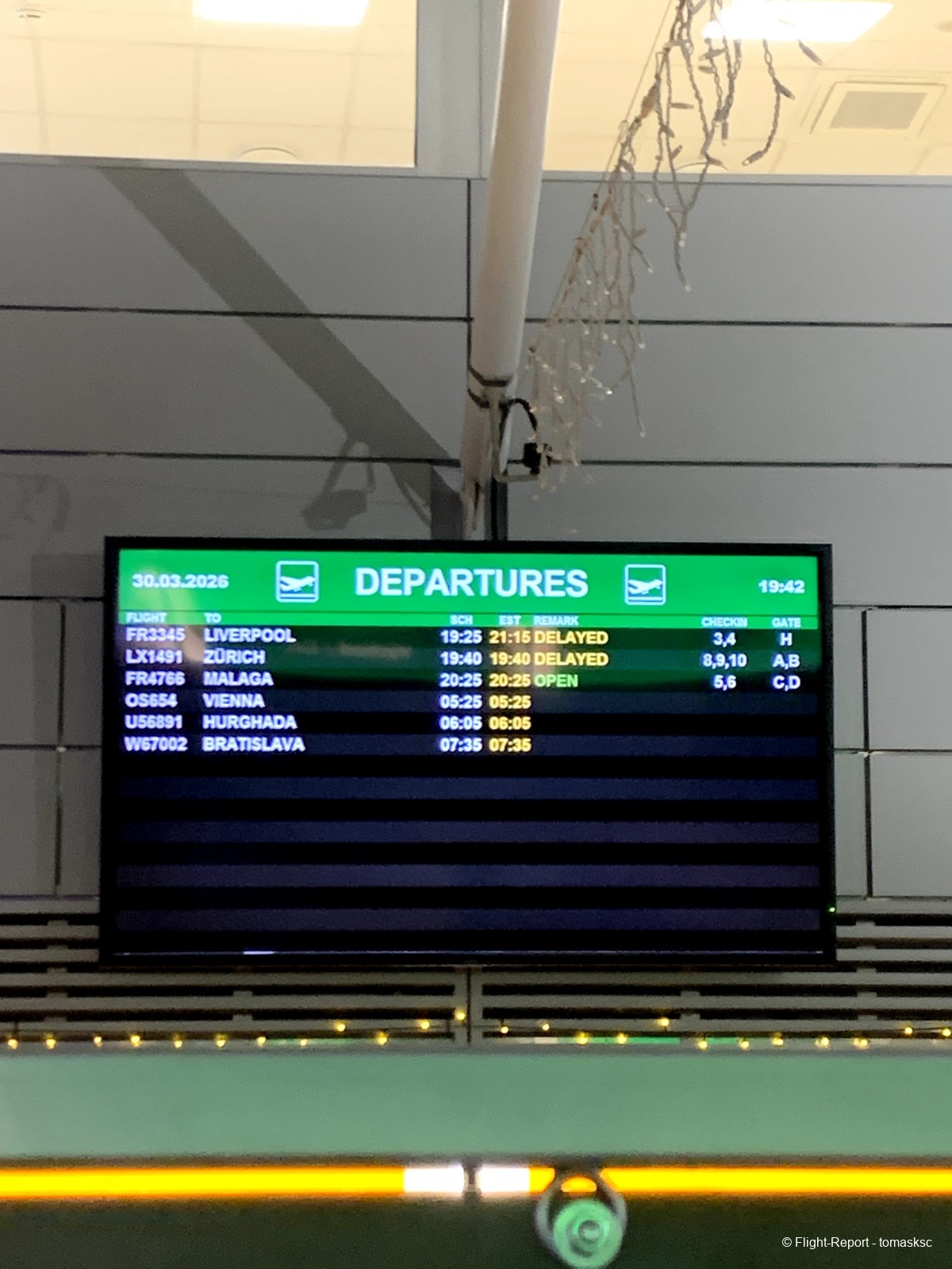 L'embarquement a débuté avec du retard depuis les portes C et D. Aux portes A et B, le vol pour Vienne était en cours d'embarquement avec l'avion stationné juste devant.Pour notre vol, la première partie de l'embarquement s'est faite en bus, afin d'éviter que les passagers ne marchent à côté de l'appareil d'Austrian. En revanche, la seconde partie s'est faite à pied, par une journée de vent très fort. Au même temps LOT embarque par la porte F.