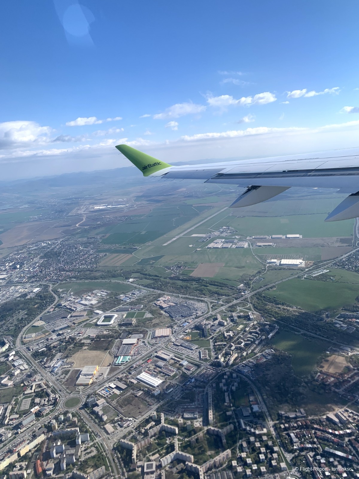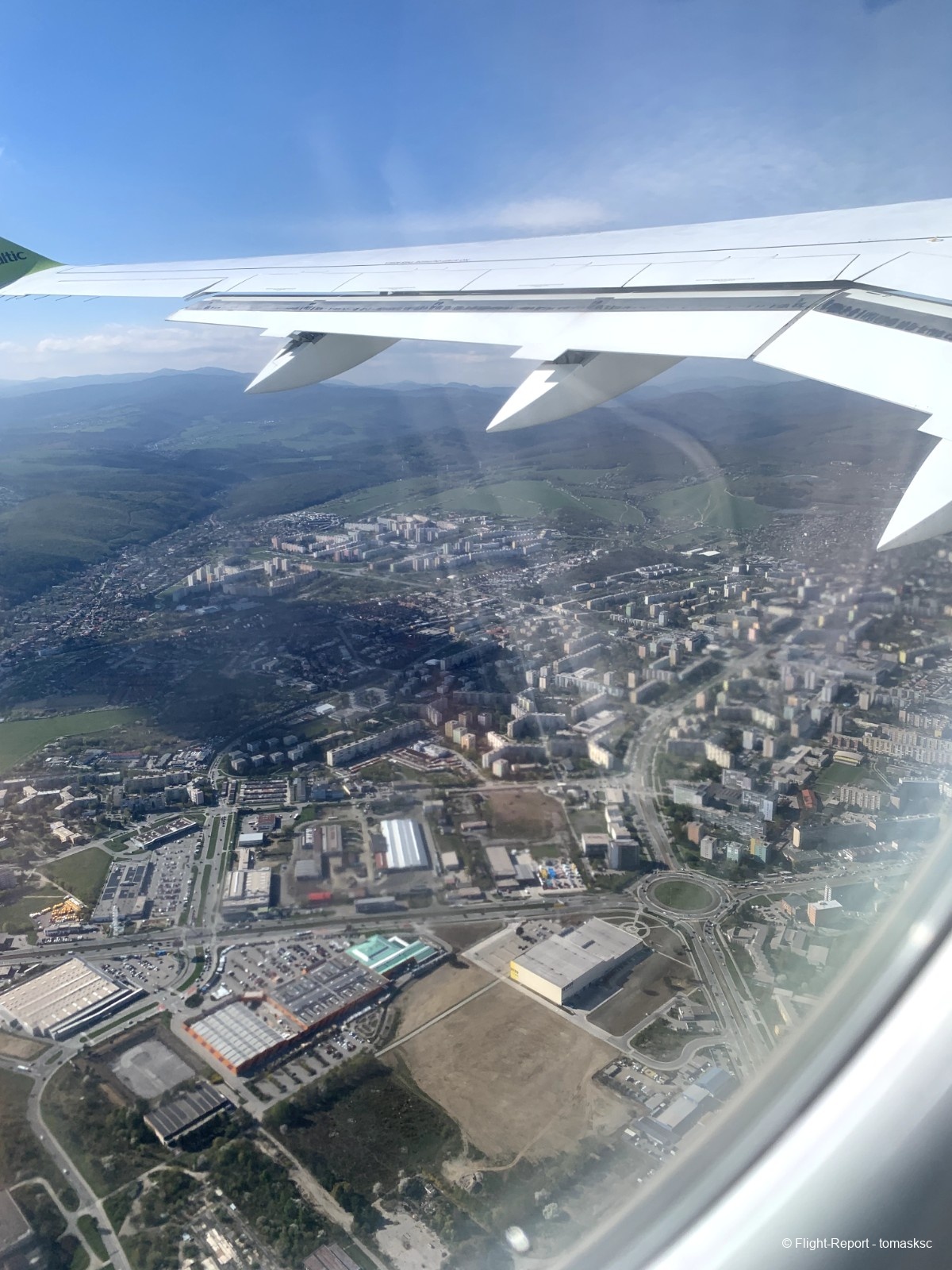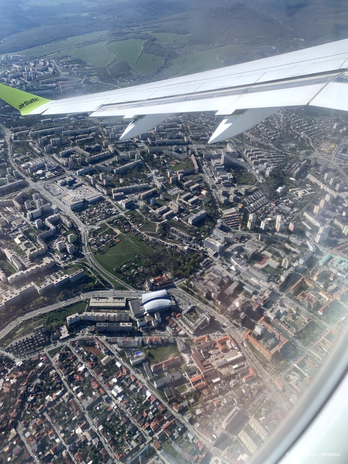 Voici le survol de Košice, une ville située dans une vallée. Normalement, les départs se font de l'autre côté, avec un survol de l'usine US Steel. Ici, on aperçoit les quartiers ouest de la ville.