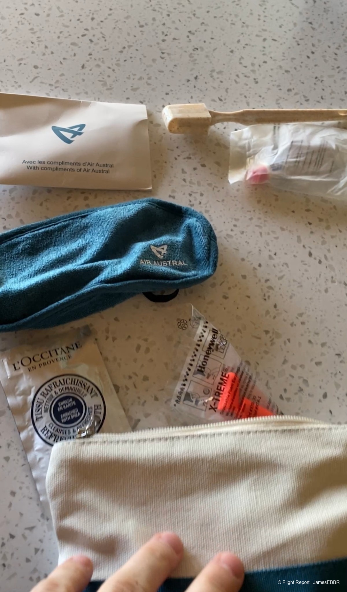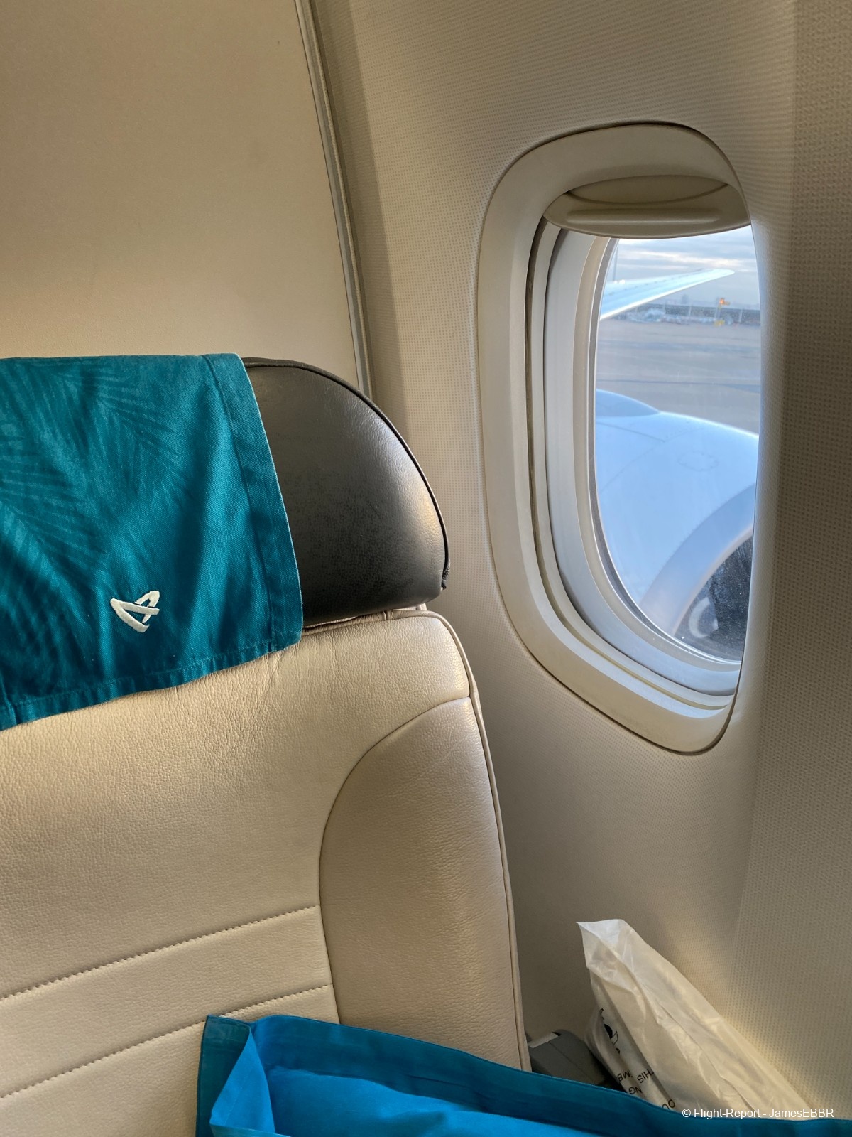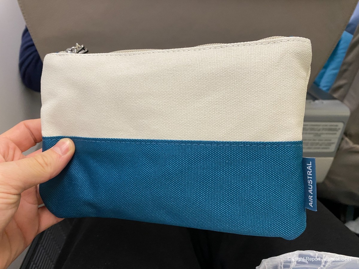 L'embarquement est rapide. A la fin de l'embarquement, une trousse confort est distribuée, ainsi qu'un verre de bienvenue. J'ai oublié de prendre une photo du plateau et du verre mais le choix était entre champagne, eau et jus (orange je crois).