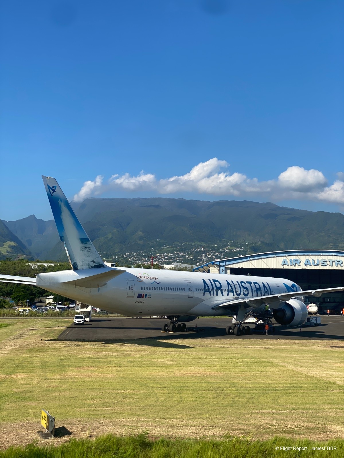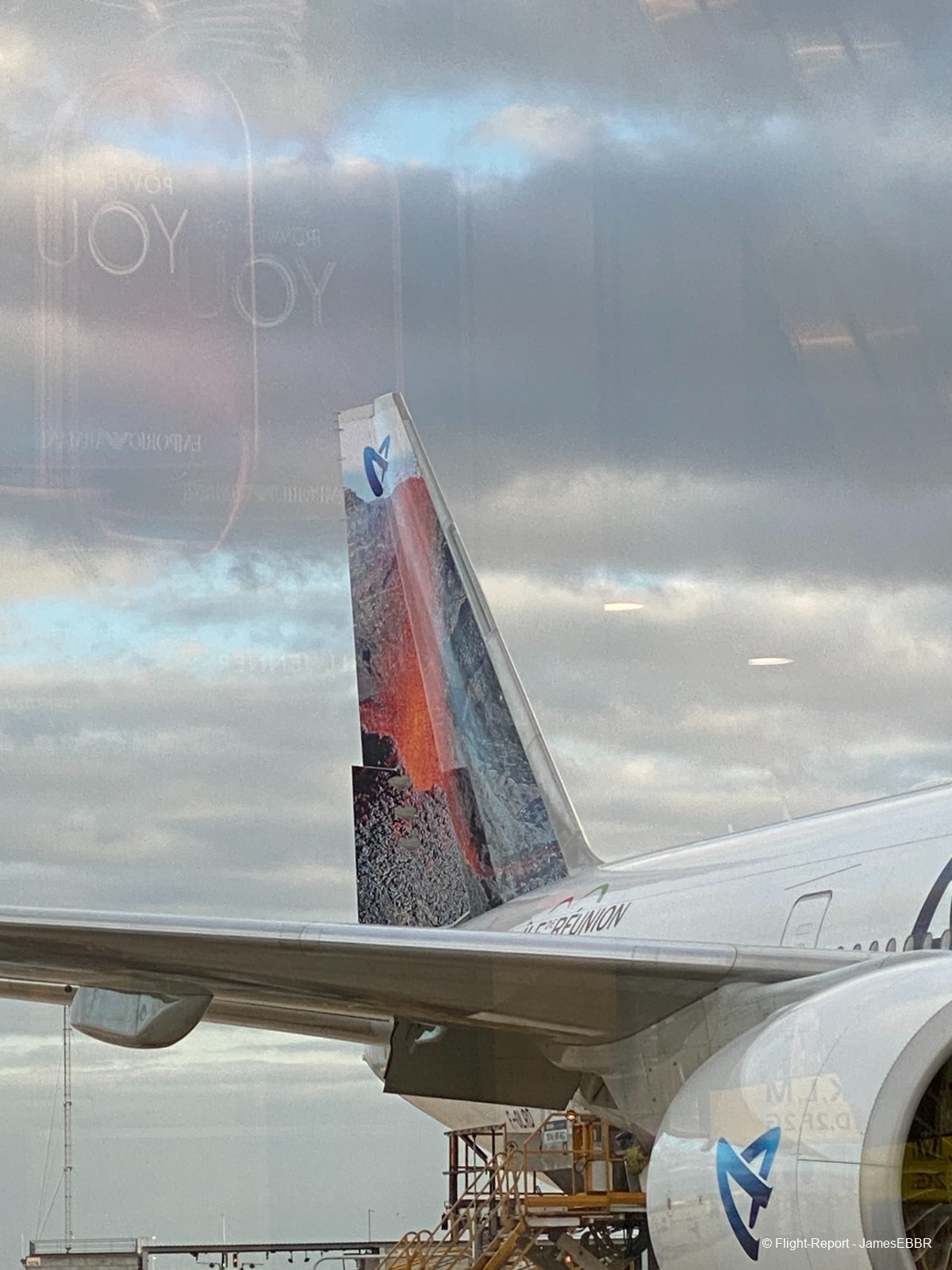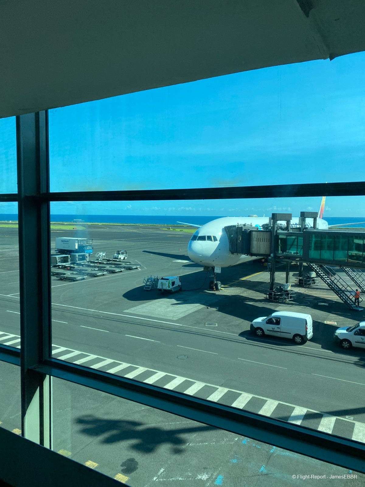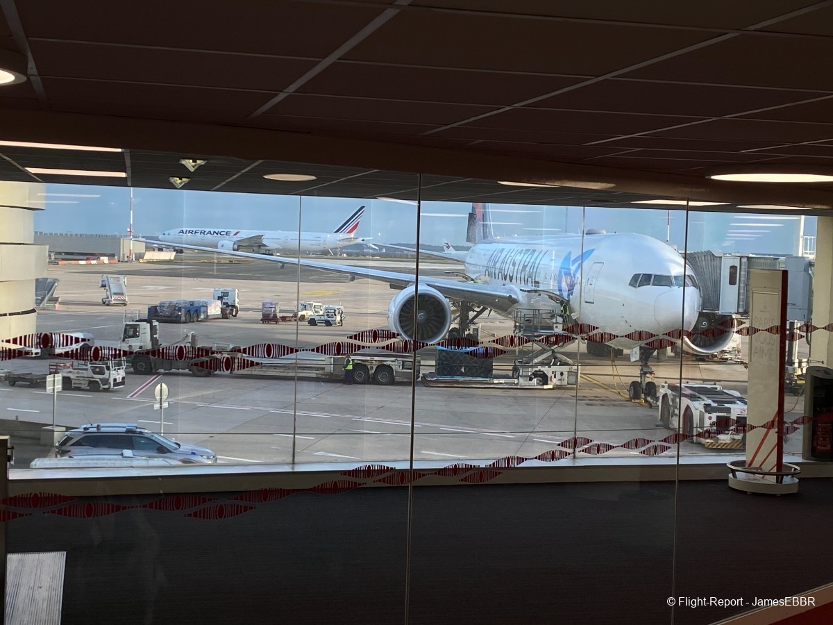 Au 2A/2C, le filtre commun est à l'étage inférieur (rez), une fois passé, on se retrouve directement face au tarmac, et là… wow… Il n'y a rien à faire, même après avoir autant voyagé, voir un 777-300ER me fera toujours le même effet. Et en plus ici, le magnifique F-OLRD, avec sa dérive recouverte d'une image du piton de la fournaise (qui a effectivement pété - comme on dit à La Réunion - et traversé la route, au moment même où ces photos ont été prises).