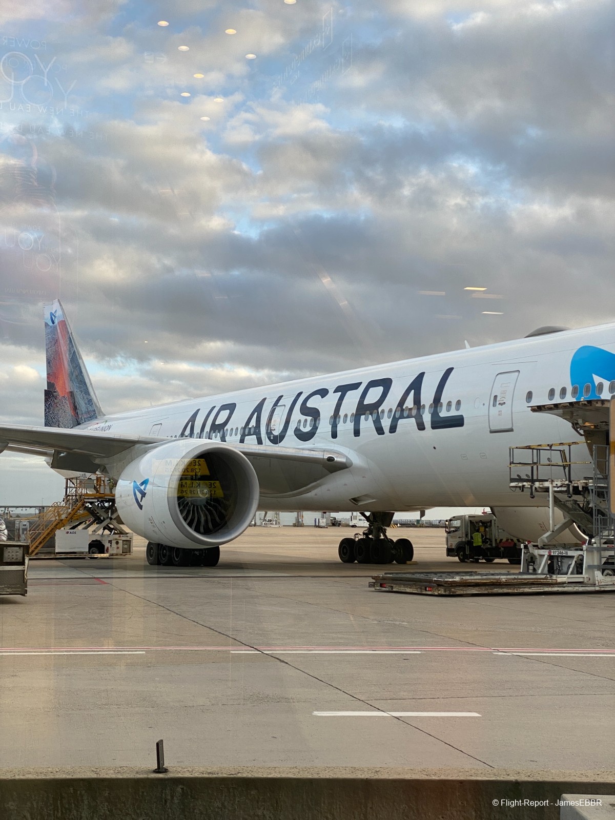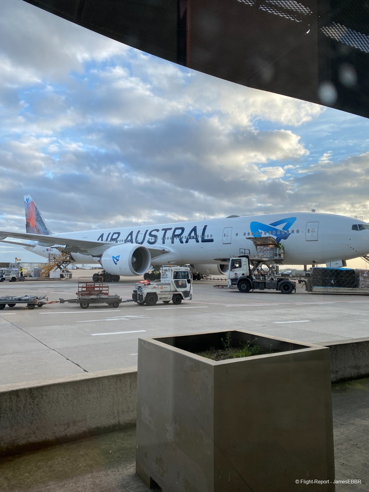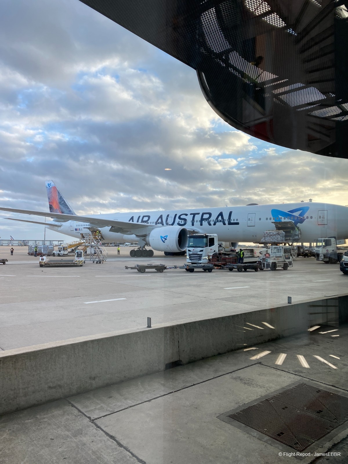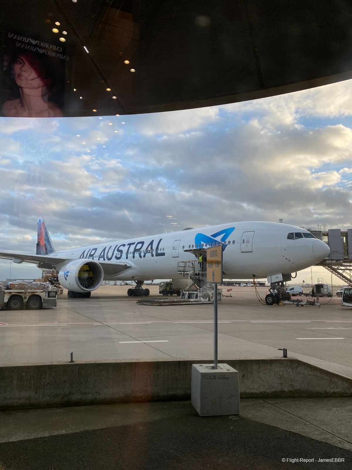 Au 2A/2C, le filtre commun est à l'étage inférieur (rez), une fois passé, on se retrouve directement face au tarmac, et là… wow… Il n'y a rien à faire, même après avoir autant voyagé, voir un 777-300ER me fera toujours le même effet. Et en plus ici, le magnifique F-OLRD, avec sa dérive recouverte d'une image du piton de la fournaise (qui a effectivement pété - comme on dit à La Réunion - et traversé la route, au moment même où ces photos ont été prises).