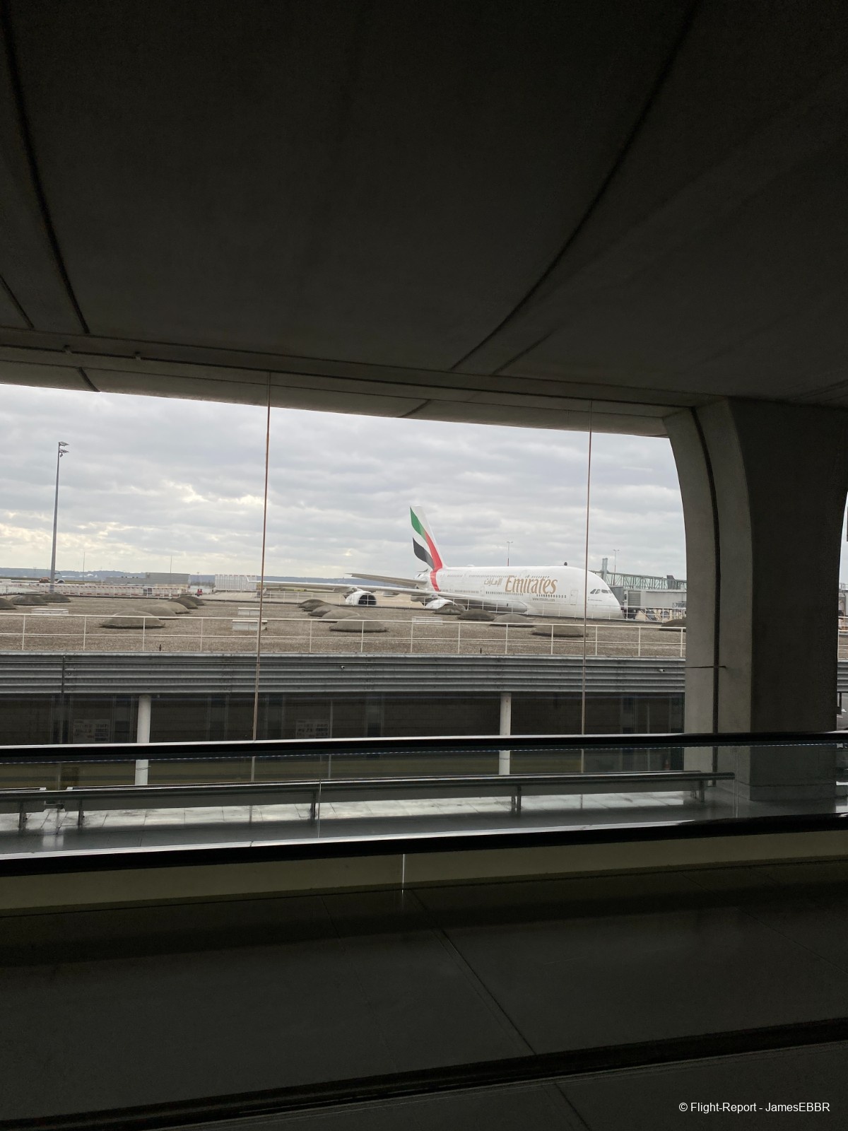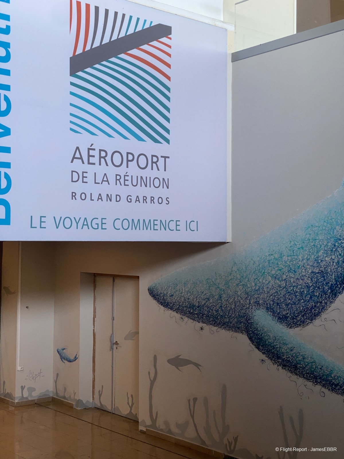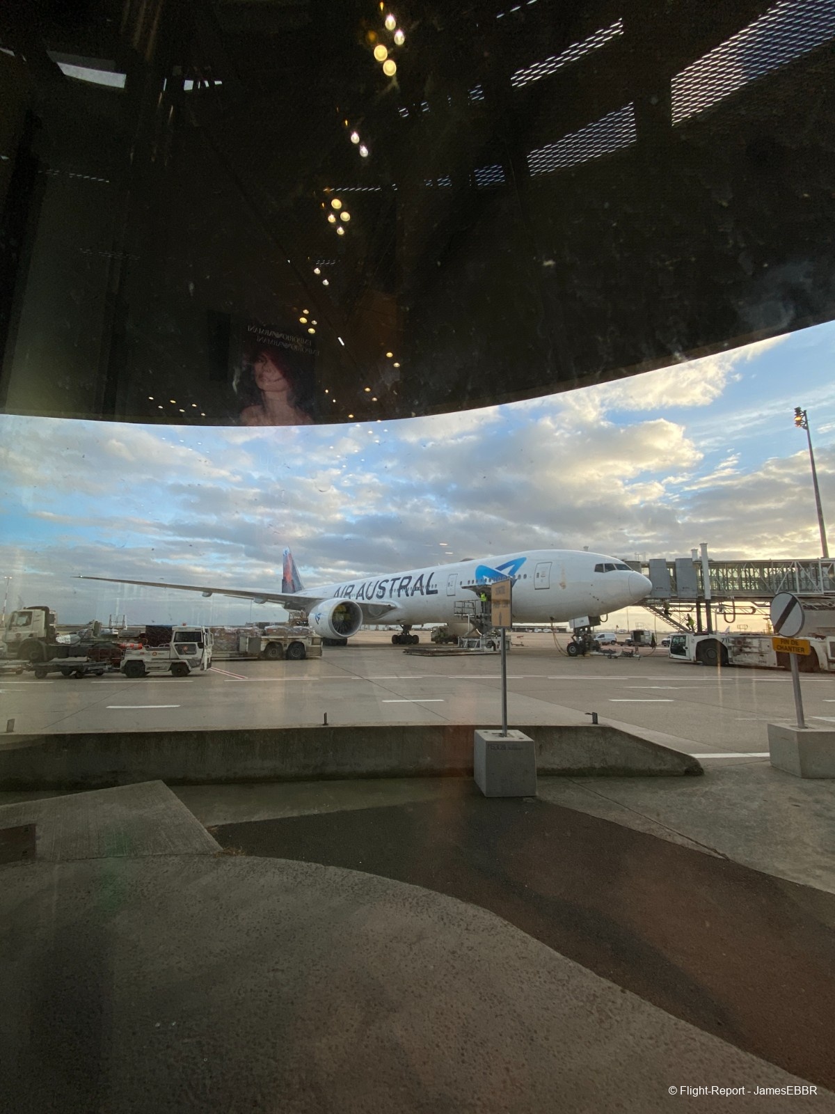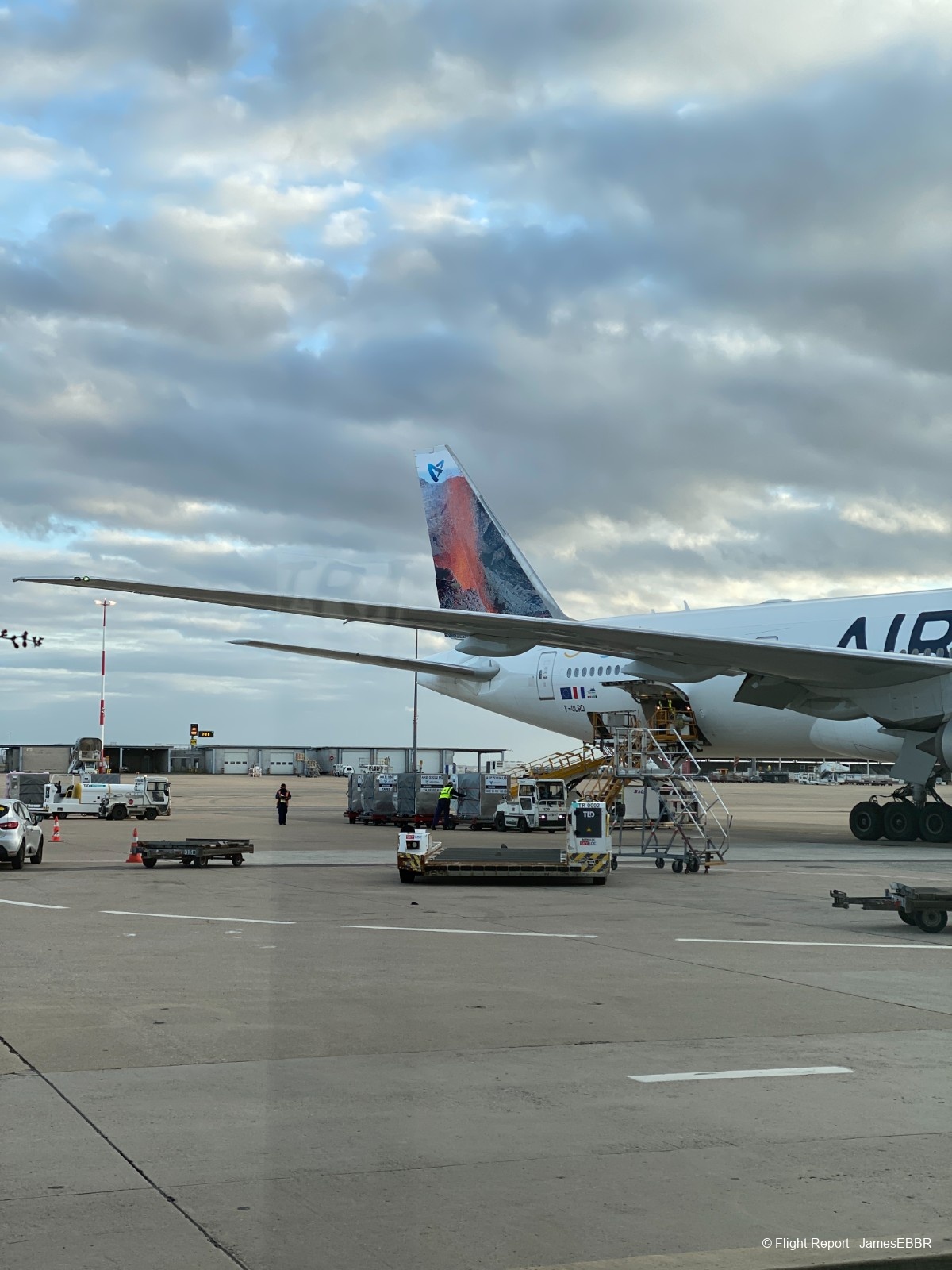Au 2A/2C, le filtre commun est à l'étage inférieur (rez), une fois passé, on se retrouve directement face au tarmac, et là… wow… Il n'y a rien à faire, même après avoir autant voyagé, voir un 777-300ER me fera toujours le même effet. Et en plus ici, le magnifique F-OLRD, avec sa dérive recouverte d'une image du piton de la fournaise (qui a effectivement pété - comme on dit à La Réunion - et traversé la route, au moment même où ces photos ont été prises).