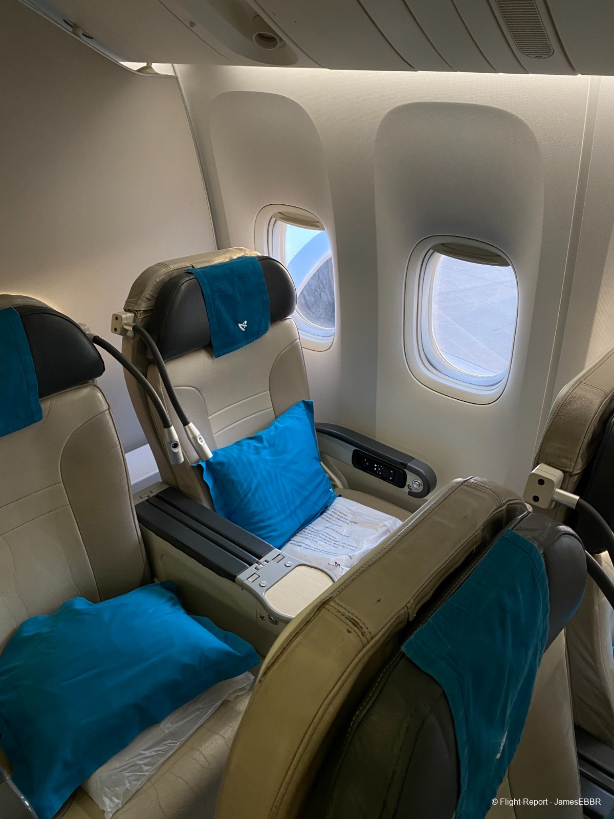Même si les sièges sont anciens et présentent des signes d'usure, la première impression est celle d'espace, de propreté, de lumière, c'est grand, blanc, beige, les sièges sont en cuir et extrêmement confortables. Bien plus que tout ce que j'ai connu par le passé en W sur AF, KL, BA, IB, etc.