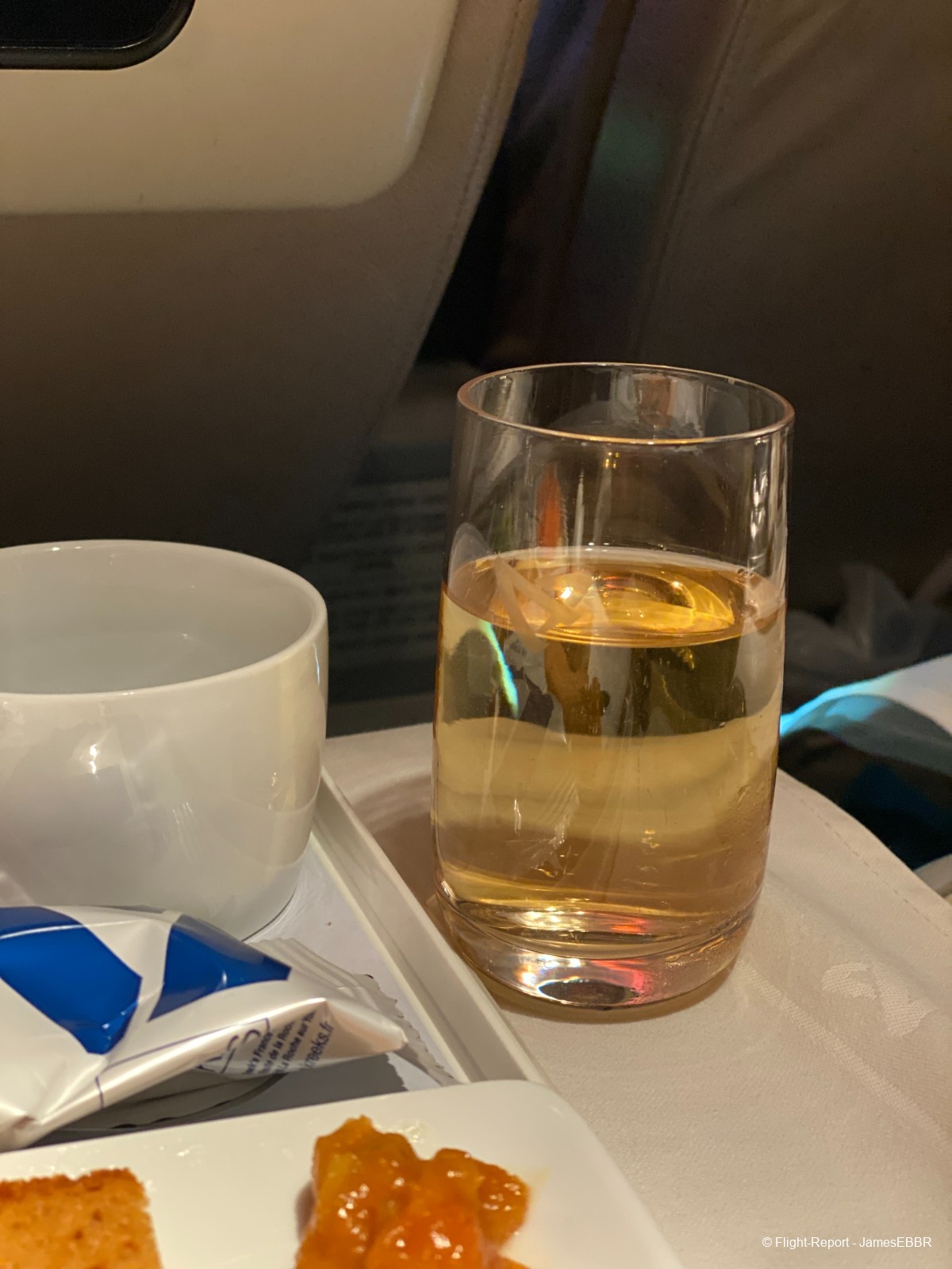 Il me sert donc… trois verres. Une coupe de champagne, un verre de vin blanc et un verre d'eau. Je ne peux pas tout ranger sur ma tablette et je dois utiliser la mini tablette entre moi et mon voisin de voyage.