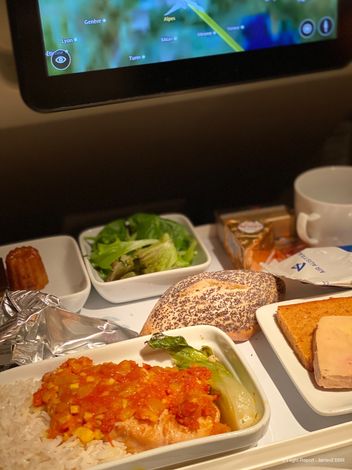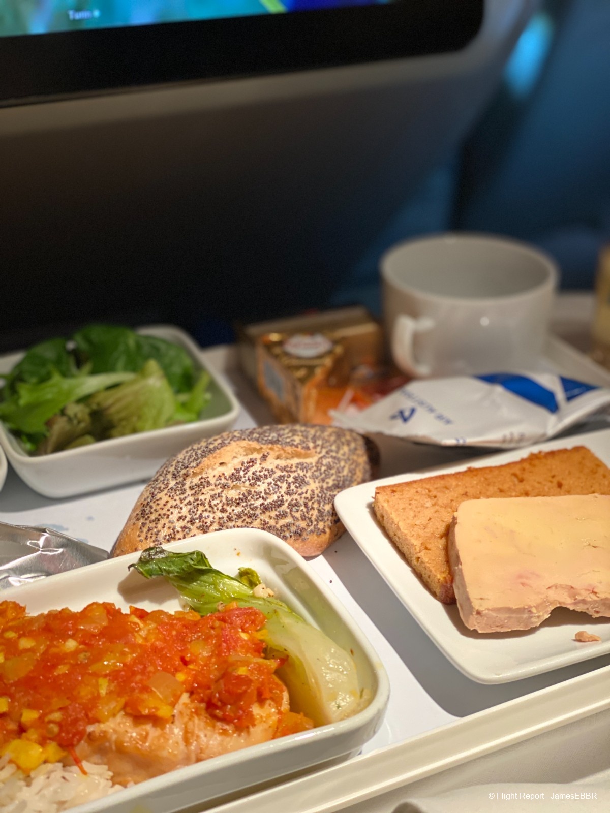 Sur le vol, une belle prestation, en particulier le catering, qui est très proche des standards de la Business. Mention spéciale pour l'entrée et le plat de Saint-Jacques, qui donnent bien envie.