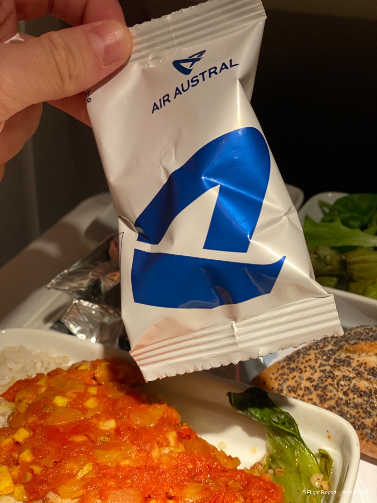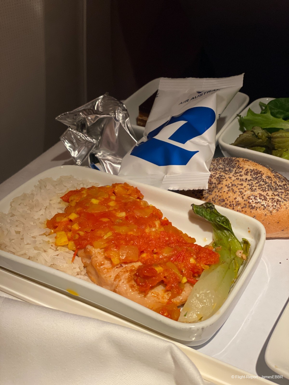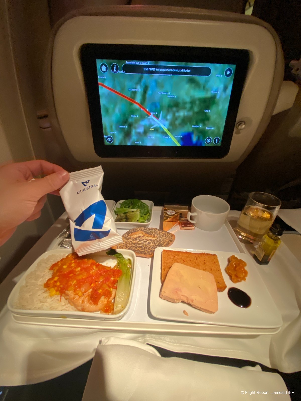 Le PNC en charge de ma rangée s'est immédiatement excusé et m'a apporté le plat que j'avais commandé. Il me propose un refill de champagne et me propose même du vin de la business (Club Austral). Et il me laisse le poulet.