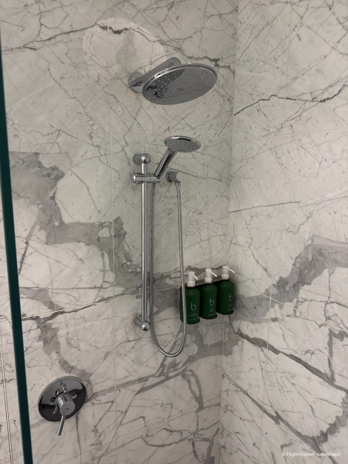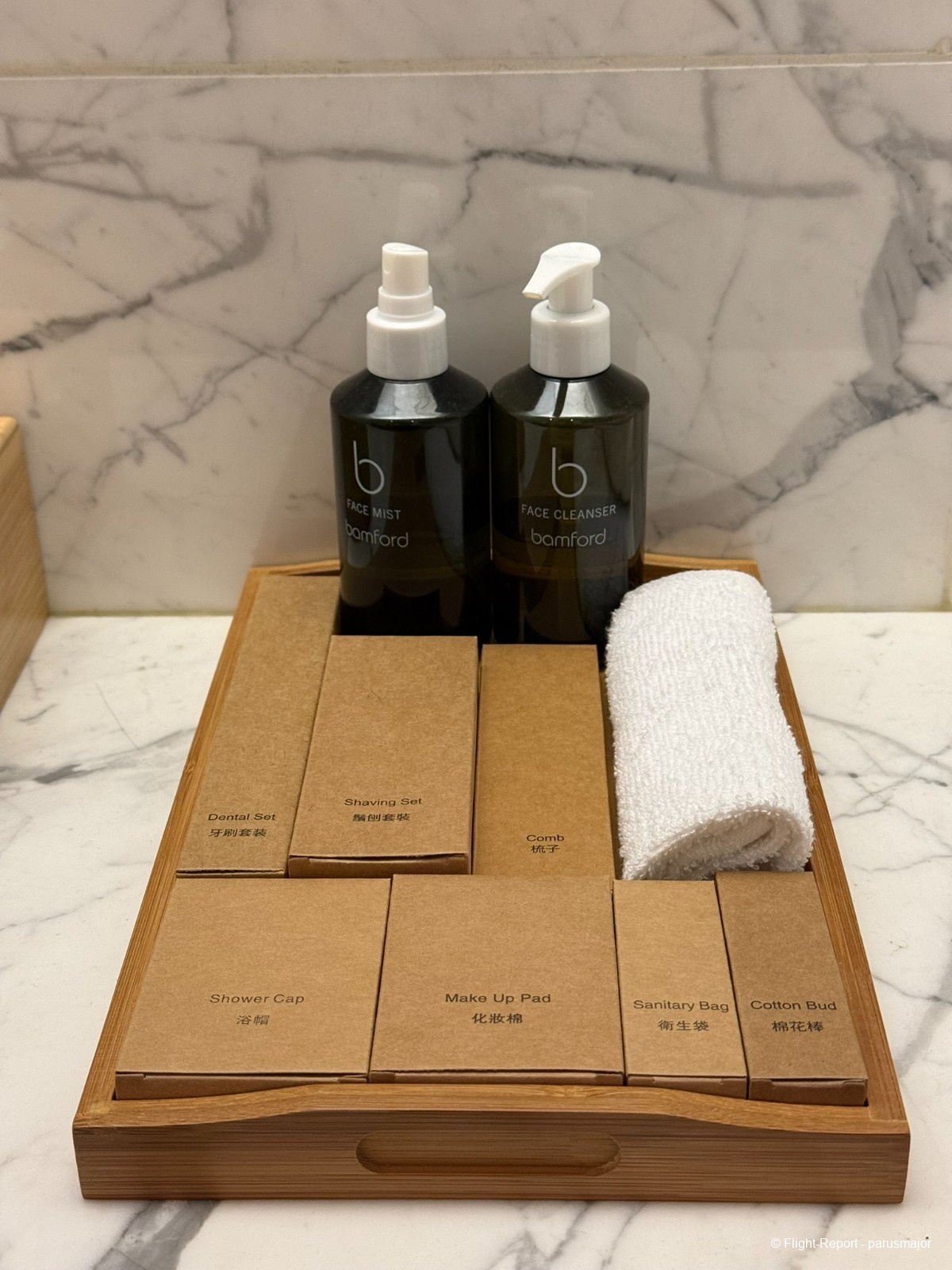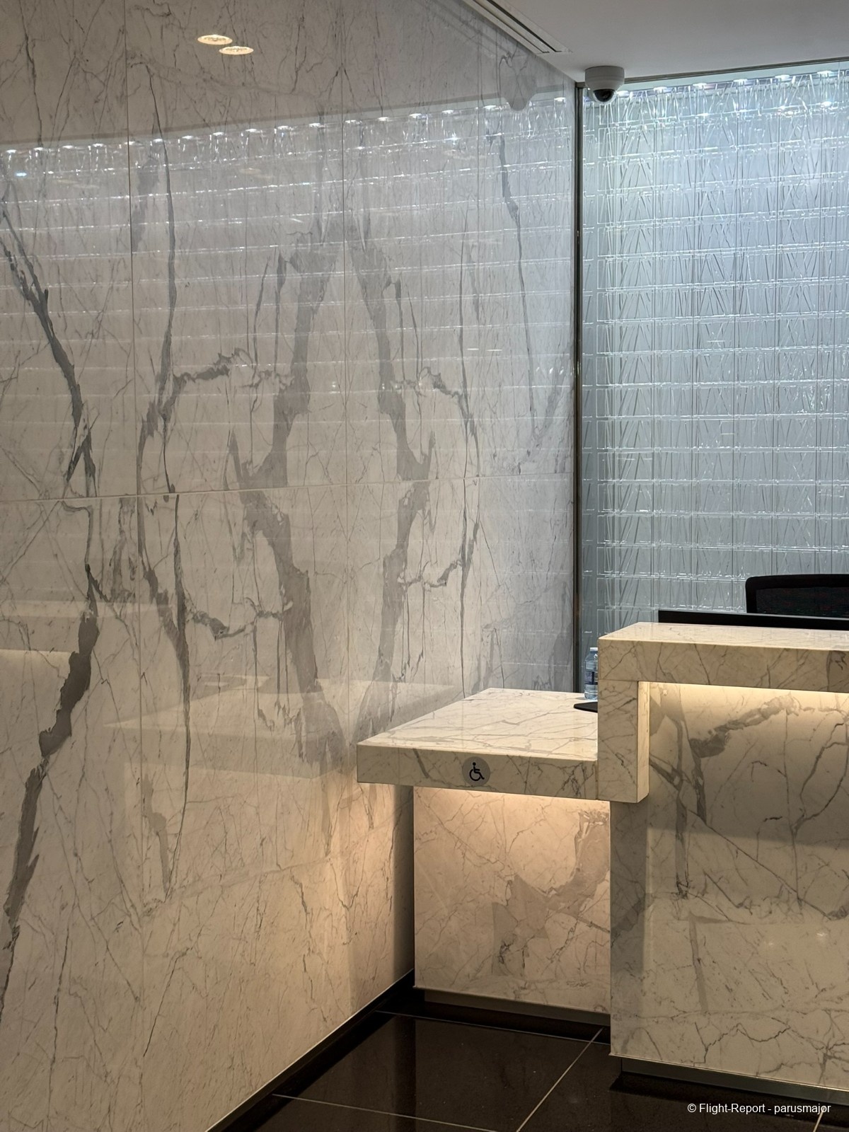 L’agent d’accueil est très classe dans son uniforme Cathay. Elle me confie à une collègue pour une visite guidée des espaces rafraîchis. Je lui explique que c'est ma première fois ici. On retrouve l'ADN Foster + Partners (le designer de The Wing à HKG) : une esthétique plus "Business" et lumineuse que le standard habituel, mêlant bois clairs, bambous, marbre blanc et granit noir.