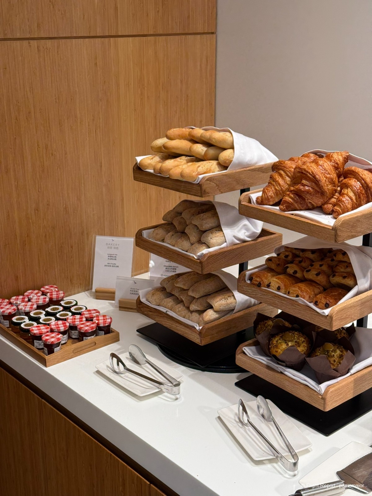 On y retrouve une offre complète de petit-déjeuner continental avec choix chauds et froids. Fromages, jambons et charcuterie, céréales, yahourts, cookies, pains, confitures, fruits, beignets, tartes chaudes, oeufs, verrines, viennoiseries, plats chauds, muffins, etc.