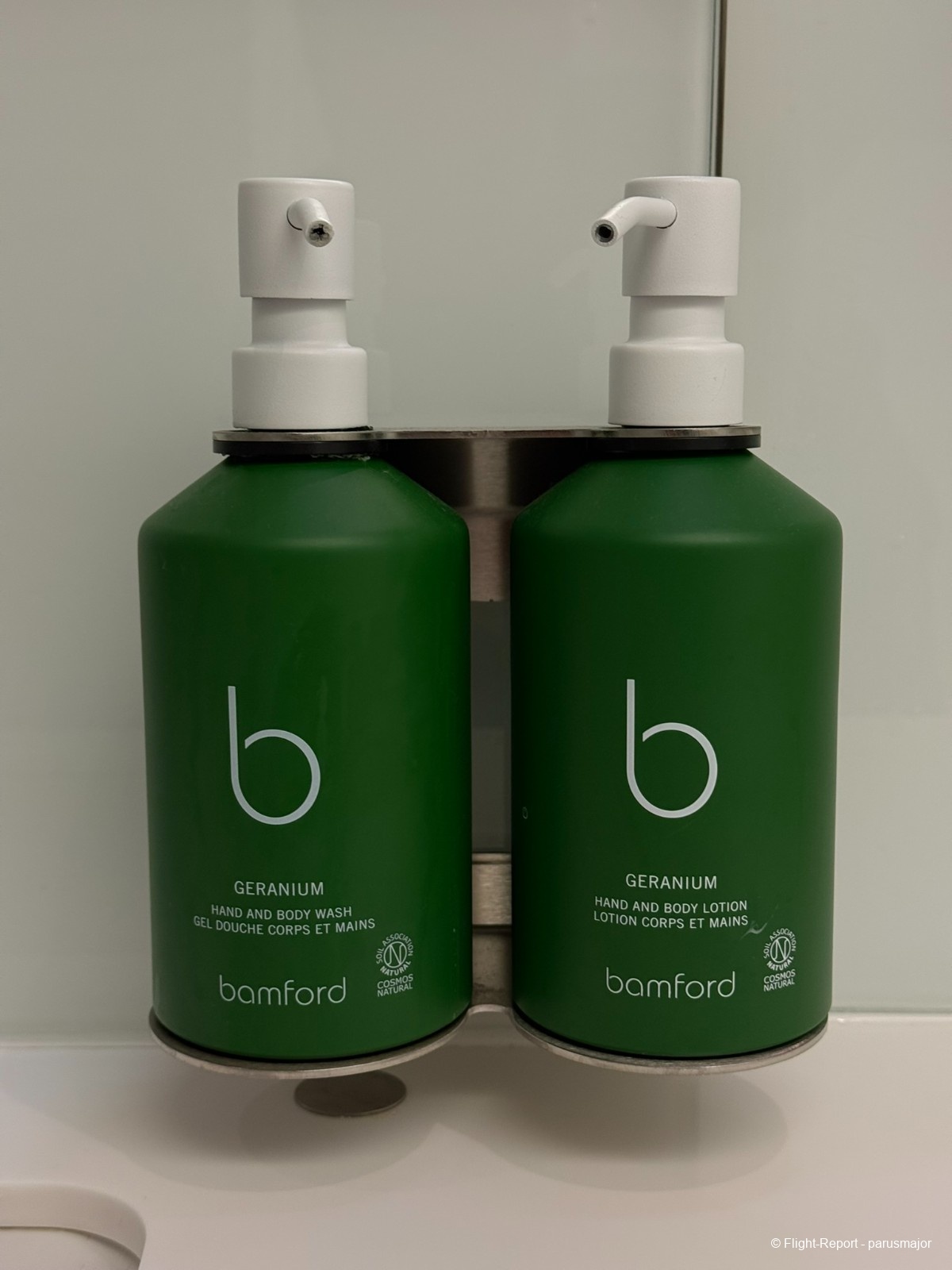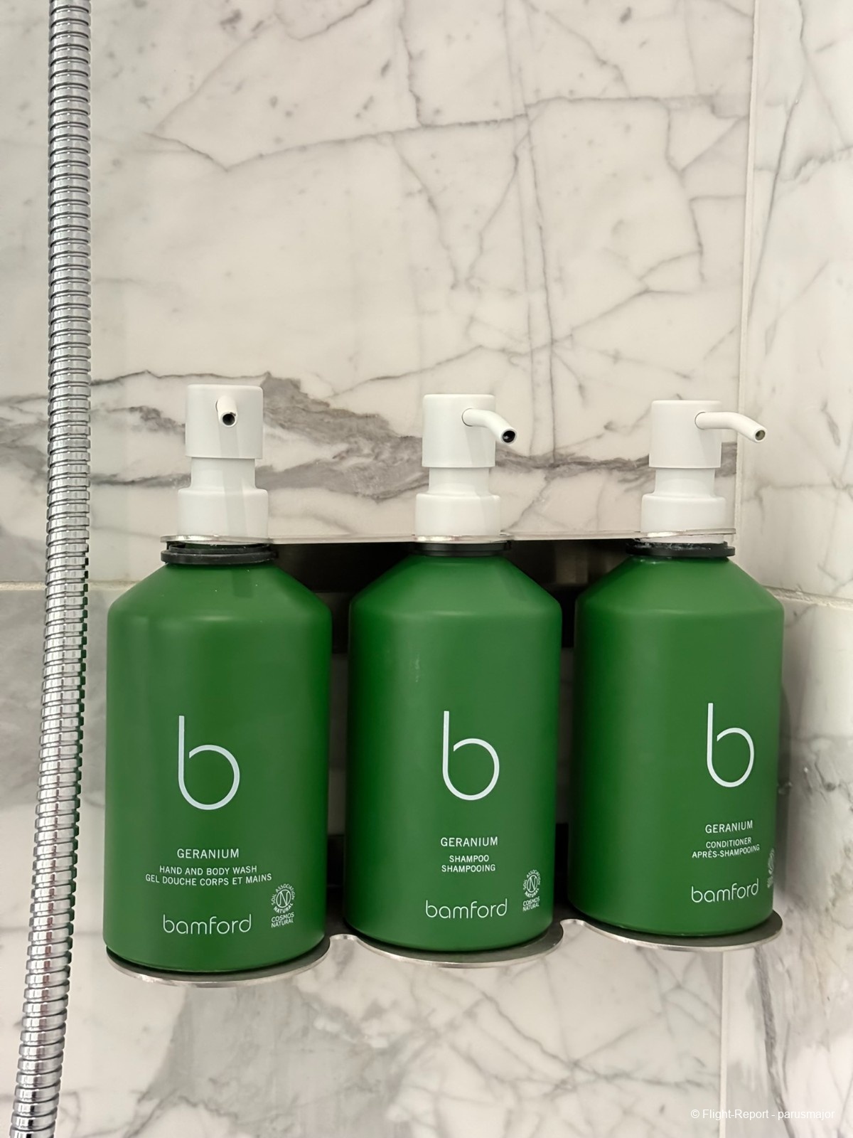 L'espace parle de lui-même, parfaitement équipé avec des produits Bamford au géranium. L’amenity kit est complet et de grande qualité, digne d'un établissement de renom.