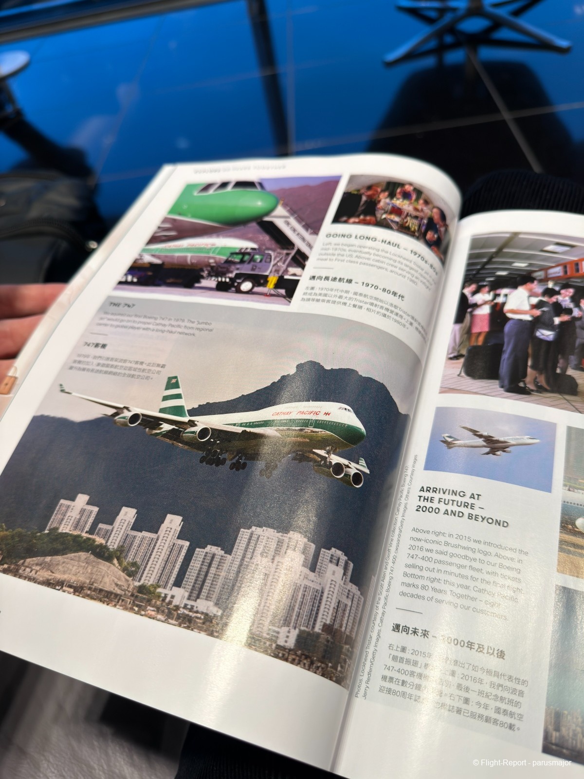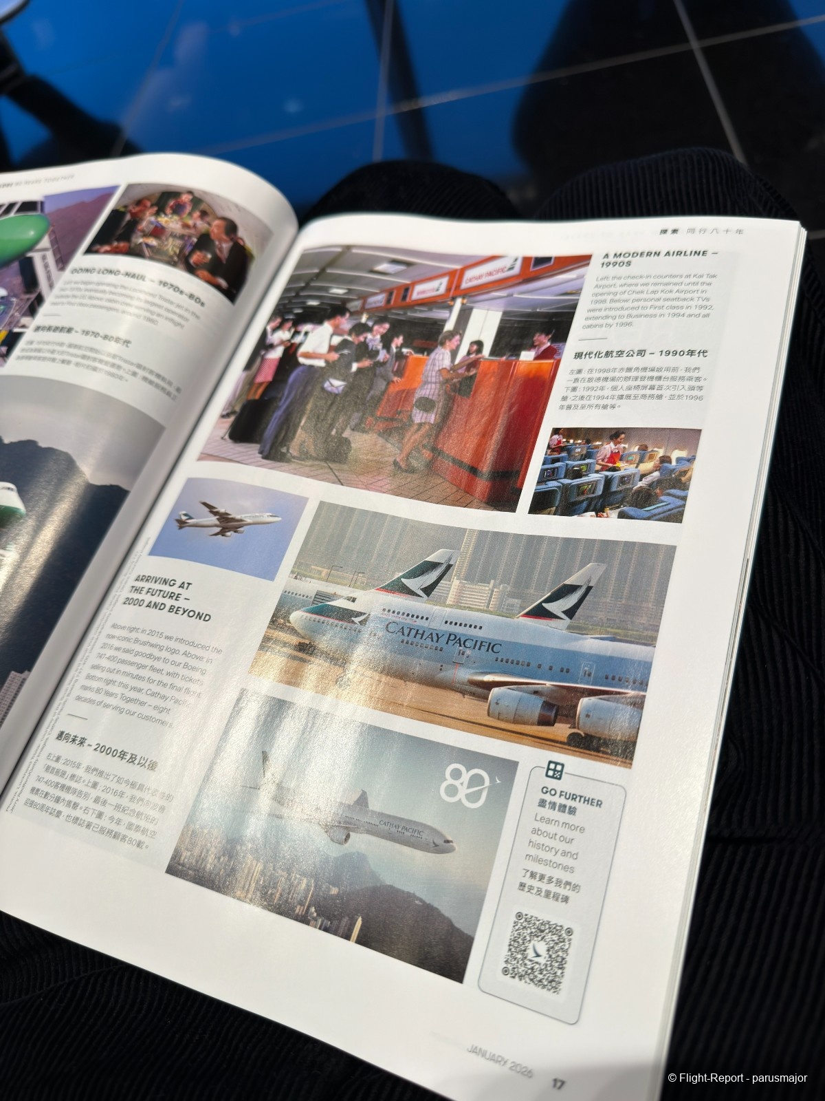 Je prends place dans l'un des fauteuils iconiques de Cathay, face à une vue imprenable sur le tarmac. Ce moment suspendu s'accompagne d'une coupe de champagne, d'un passage obligé par le Noodle Bar, et de la lecture du magazine de bord - lequel célèbre les 80 ans de la compagnie cette année. Je rêve un peu de Kai Tak…