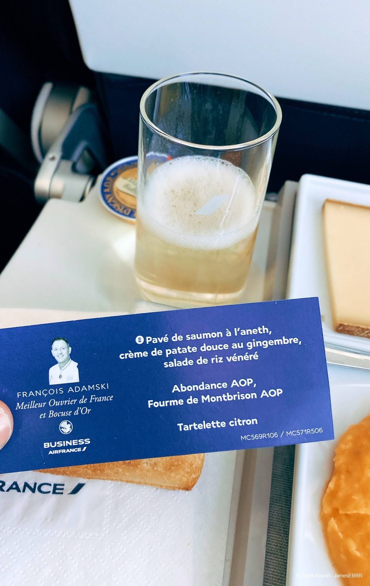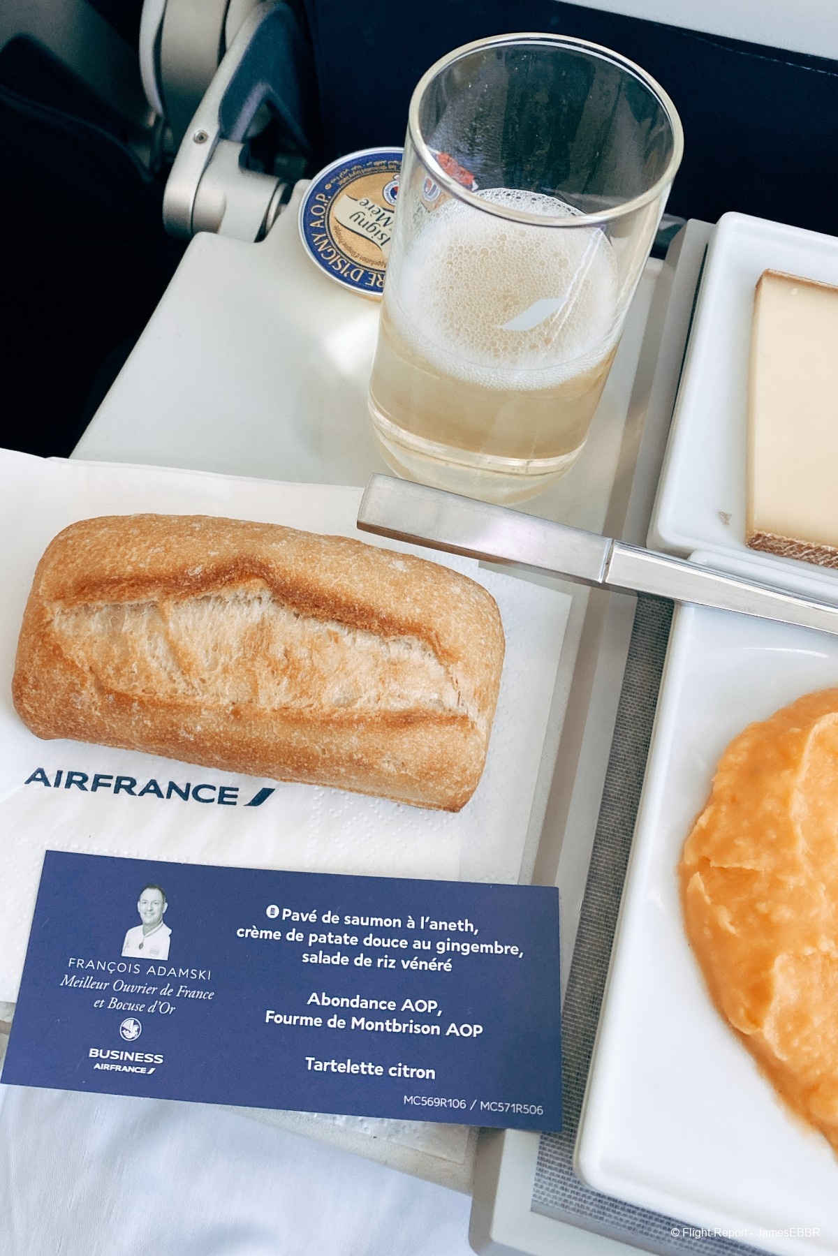 Le plateau est déposé sur ma tablette à 12h22. Je demande une coupe de champagne et je suis servi 5 minutes plus tard. Le pain est chaud. Vive la France.