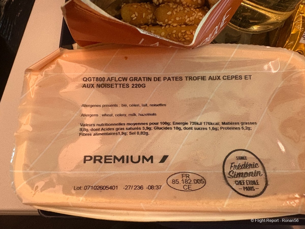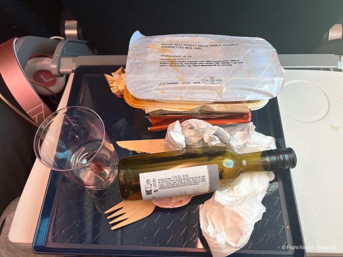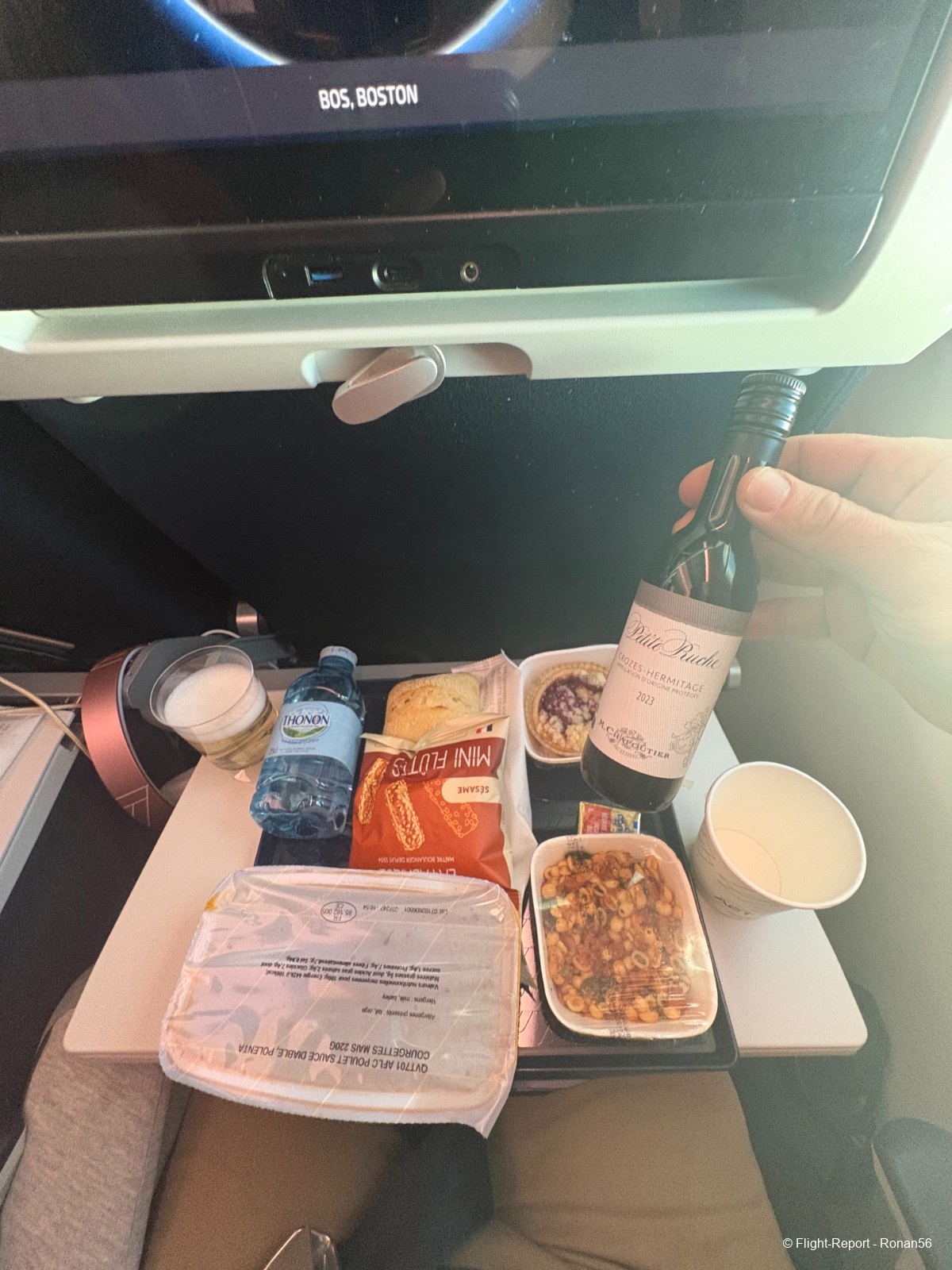 Pas de menu sur l'écran mais on a le choix entre poulet sauce diable et pates au pesto…et le plat de la premium! L'hôtesse en charge de notre allée est très avenante et sympathique, étant donné que nous sommes placé juste derrière la premium elle nous propose le plat de la premium (gratin de pates a la truffe) et même le vin rouge (un Crozes Hermitage de chez Chapoutier!)