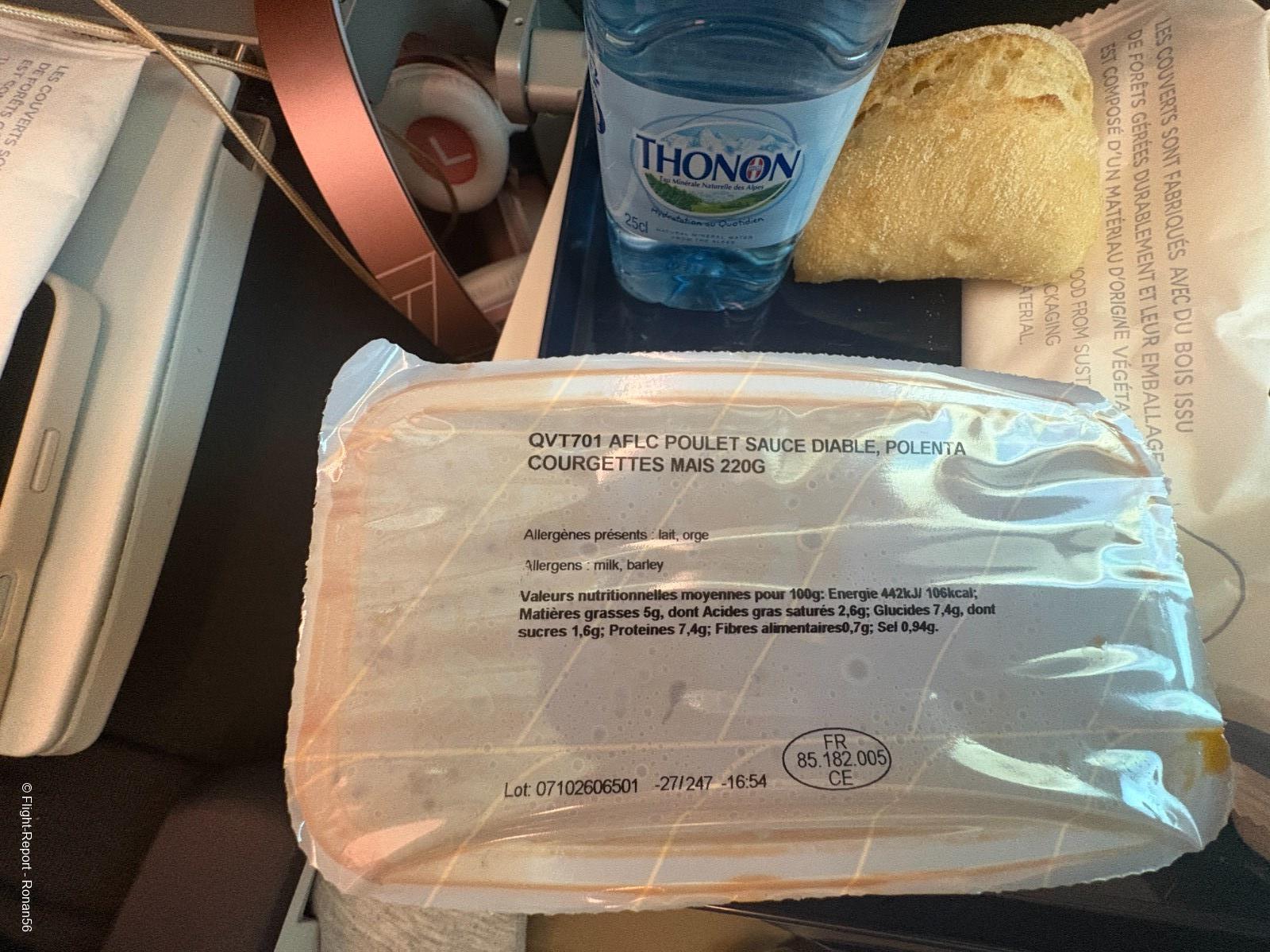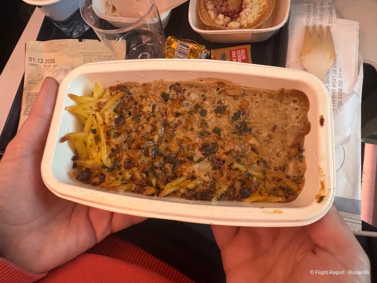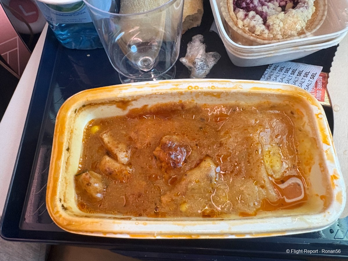 Pas de menu sur l'écran mais on a le choix entre poulet sauce diable et pates au pesto…et le plat de la premium! L'hôtesse en charge de notre allée est très avenante et sympathique, étant donné que nous sommes placé juste derrière la premium elle nous propose le plat de la premium (gratin de pates a la truffe) et même le vin rouge (un Crozes Hermitage de chez Chapoutier!)