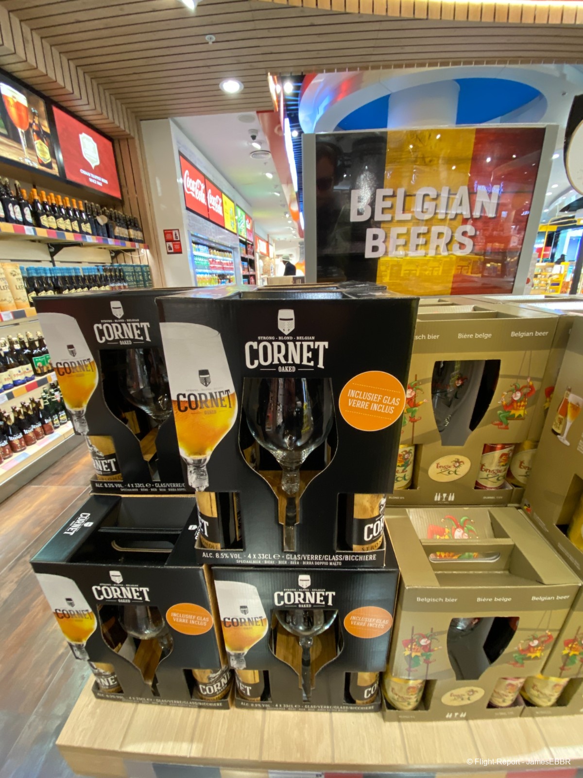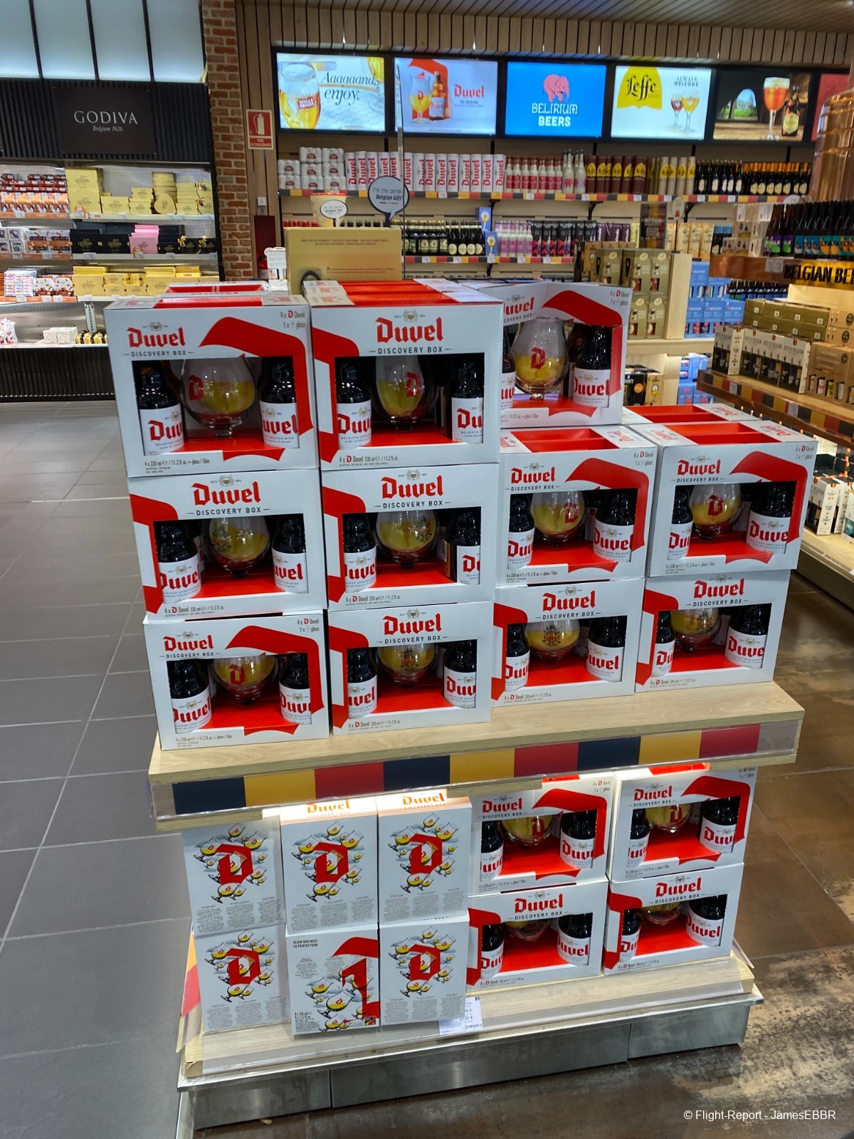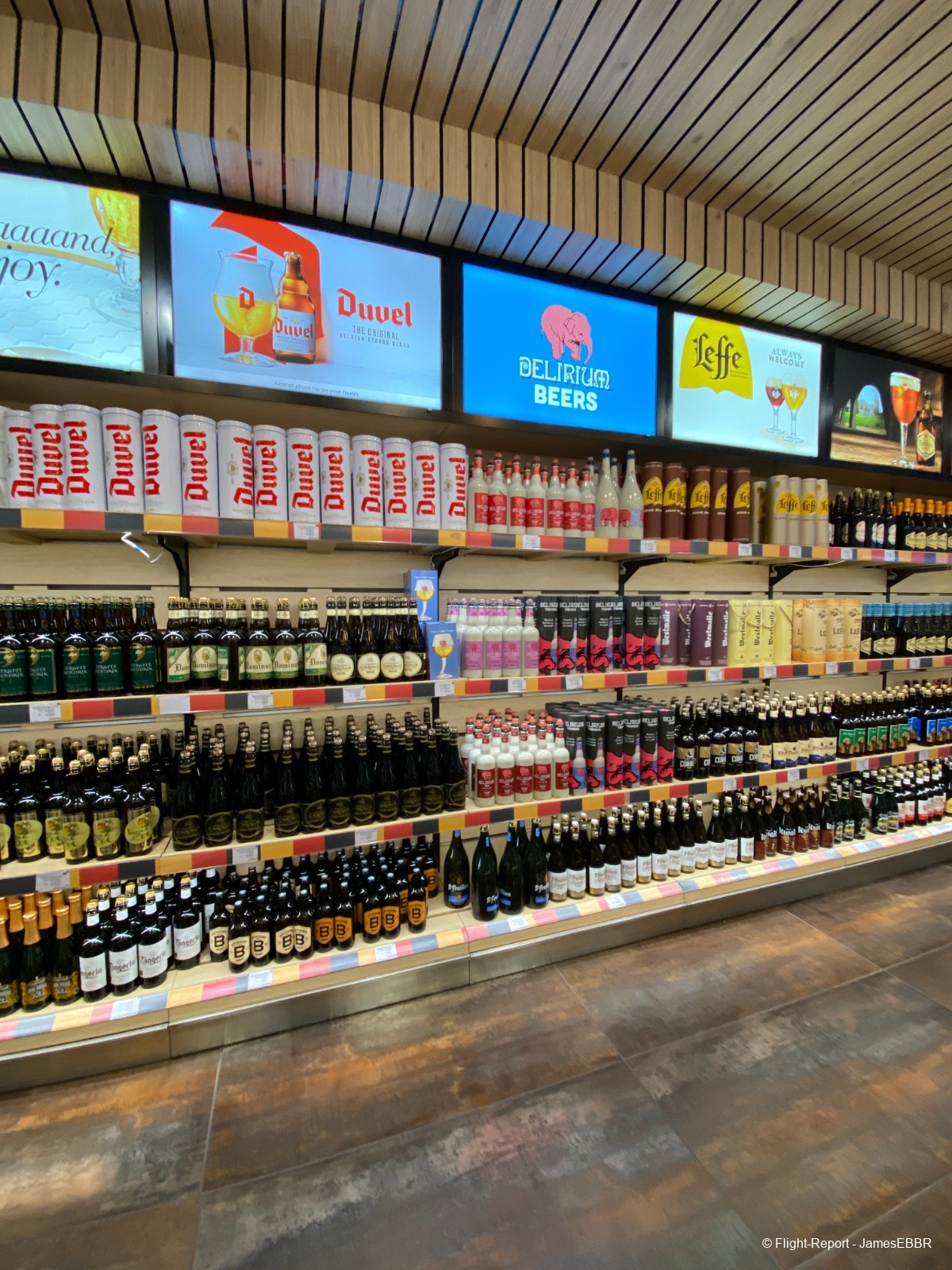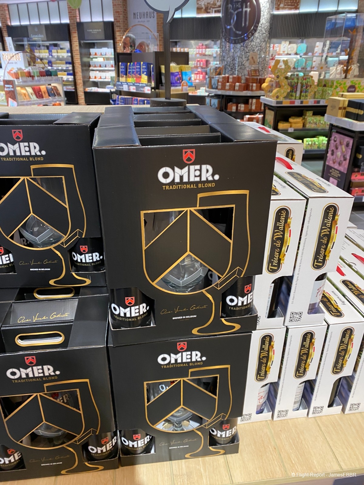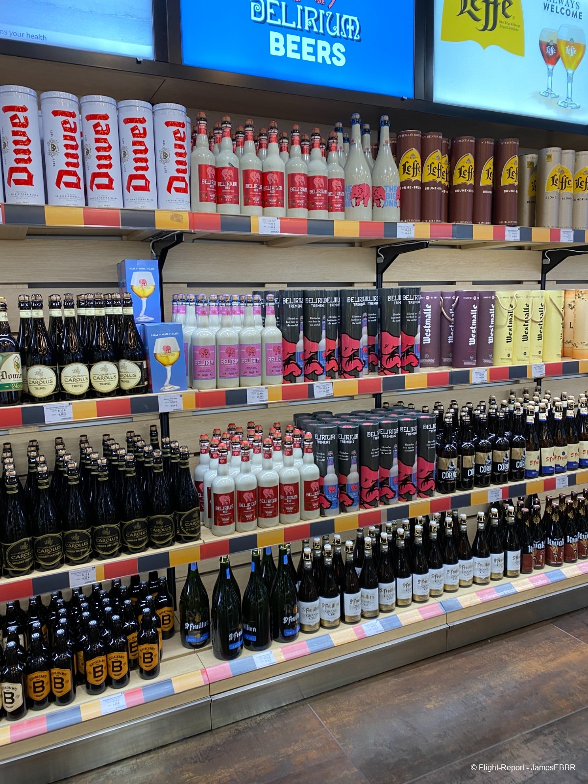 Le duty free d'EBBR propose une large sélection de produits belges, notamment un grand choix de bières, ainsi que des gaufres et des fromages.