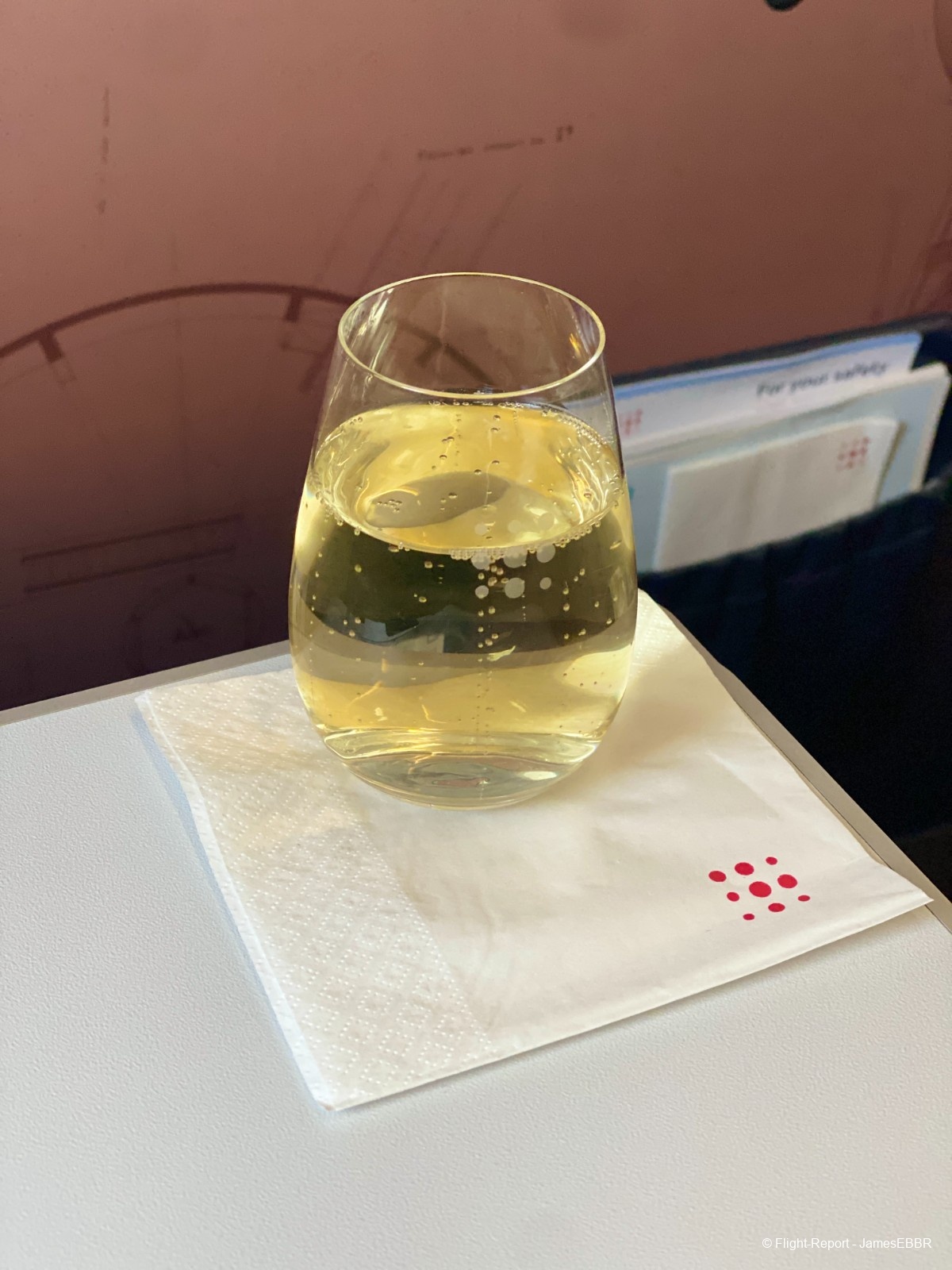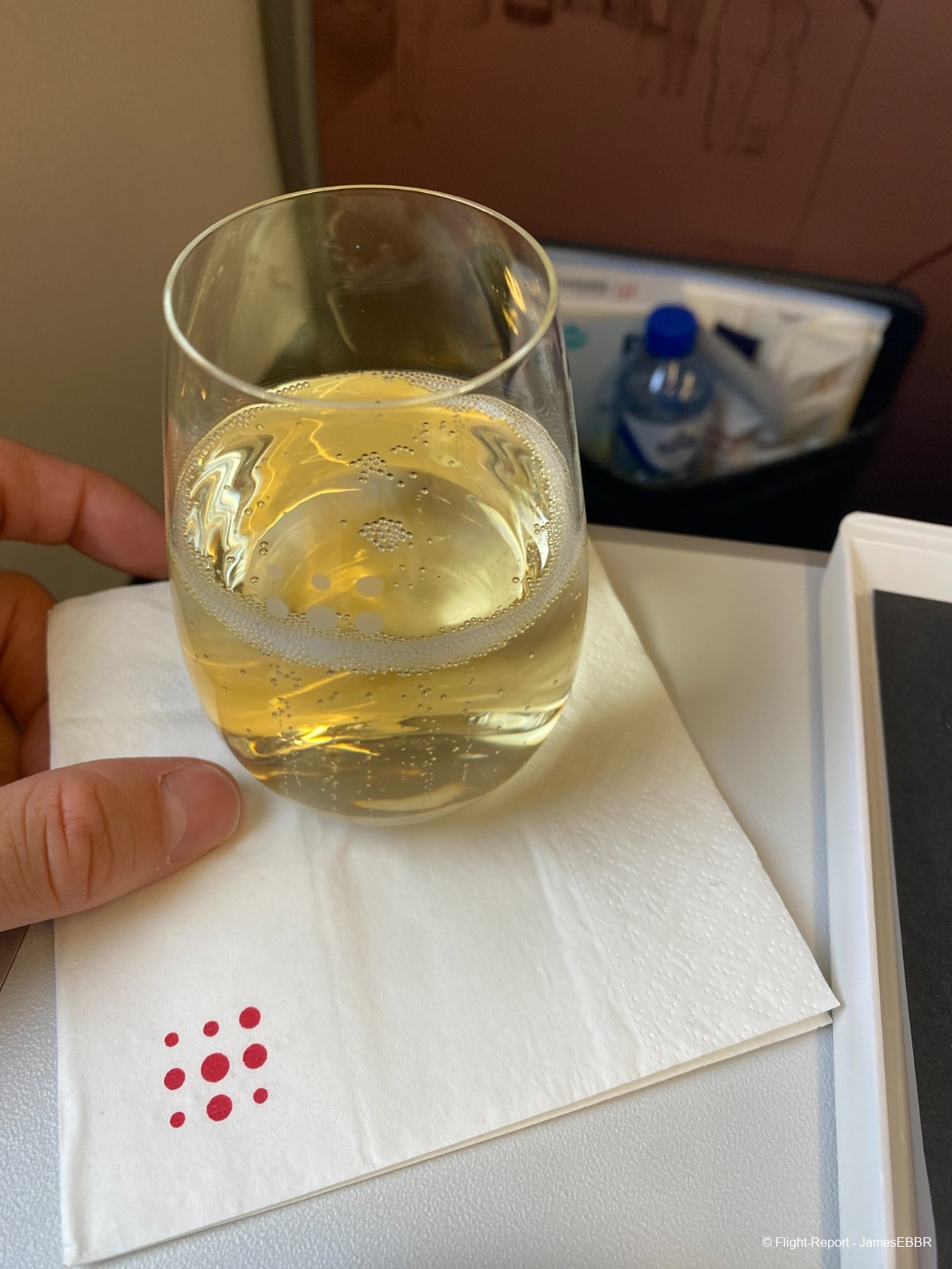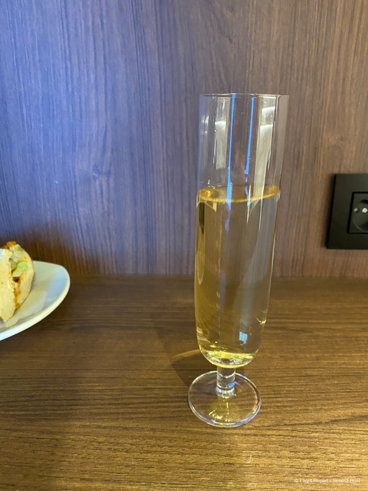 L'hôtesse m'a demandé ce que je souhaitais boire. J'ai demandé du champagne. Elle m'a expliqué qu'ils proposaient du vin mousseux, mais pas de champagne ; ce sera du crémant. J'ai oublié de noter le nom cependant.