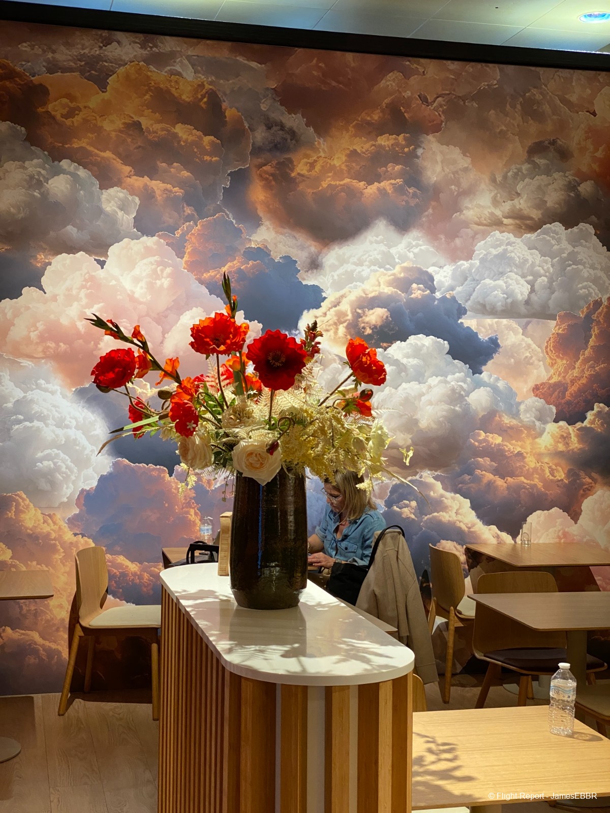 Des fleurs, des nuages, des plantes tropicales, des rideaux rouges, comme dans une maison close. Okay… L'endroit est bondé, on ne trouve quasiment rien à manger à part des sandwichs et des salades dans des boîtes en carton, et il n'y a pas de buffet pour l'alcool ; il faut aller au bar et demander aux hôtesses, qui sont plus intéressées à bavarder entre elles.