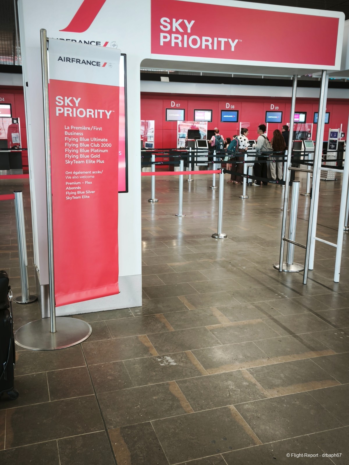 J'arrive à l'aéroport à la dépose minute. Direction les comptoirs Sky Priority ou je me ferai allègrement doubler par des non Sky Priority que les agents Air France les verront avant moi. Je fais partir ma valise dans les entrailles mécaniques de TLS.